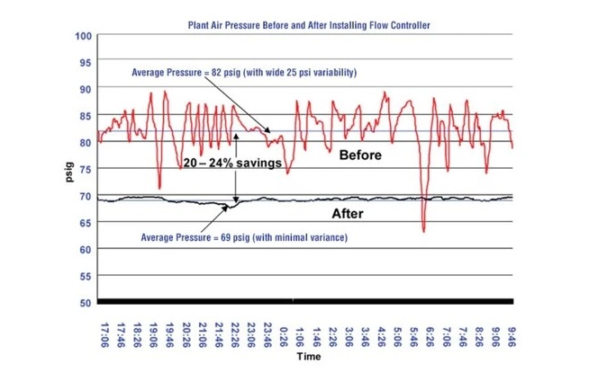 Flow controllers separate the supply side from the distribution system. Controllers create "real" storage within the receiver tank by accumulating compressed air without delivering it downstream. Total air consumption is reduced by virtually eliminating artificial demand and substantially reducing leakage. Stored compressed air is available to satisfy demand spikes without pressure drop or requiring stand-by compressors to engage.