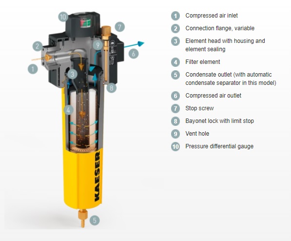KAESER inline compressed air filters are the key components for producing compressed air to all purity classes as per ISO 8573-1-and all with exceptionally low differential pressure. Moreover, their service-friendly design not only allows simple, error-free opening and closing of the filter housing, but also enables quick and clean element changes.