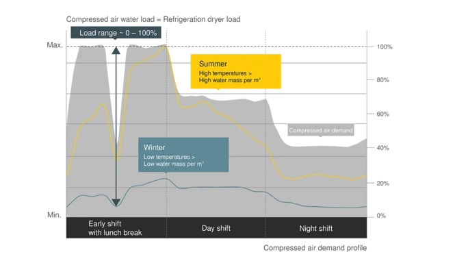 The load on a refrigerated dryer doesn't just depend on the volume of compressed air to be dried (grey area), but more importantly depends on how much water the incoming compressed air contains. The volume of water (moisture) increases as the temperature rises, so the load on refrigerated dryers increases dramatically when ambient temperatures are high, such as during summer (yellow curve). Conversely, when the temperature drops during the winter (turquoise curve), there is less load on refrigerated dryers. To maintain a stable pressure dew point throughout these fluctuations, refrigerated dryers should be designed to provide sufficient performance during peak load times, and have additional reserve capacity. Like the flow rate and temperature range, refrigerated dryers are always operating within the load range of 0 to 100 %. Because SECOTEC storage control ensures energy is only used as needed across this entire load range, users benefit from exceptional savings. |