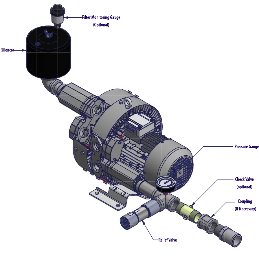 N/A All Republic Regenerative Blowers are available in pre-assembled kits for either pressure or vacuum applications. These kits include an inlet filter, gauge and relief valve, and are factory tested prior to shipment. Optional items for these kits include check valve, and tube adaptor; washdown motors, explosion proof motors, or other specialty motors; noise enclosures; and control panels such as VFD's, PLC's, or starter panels. |