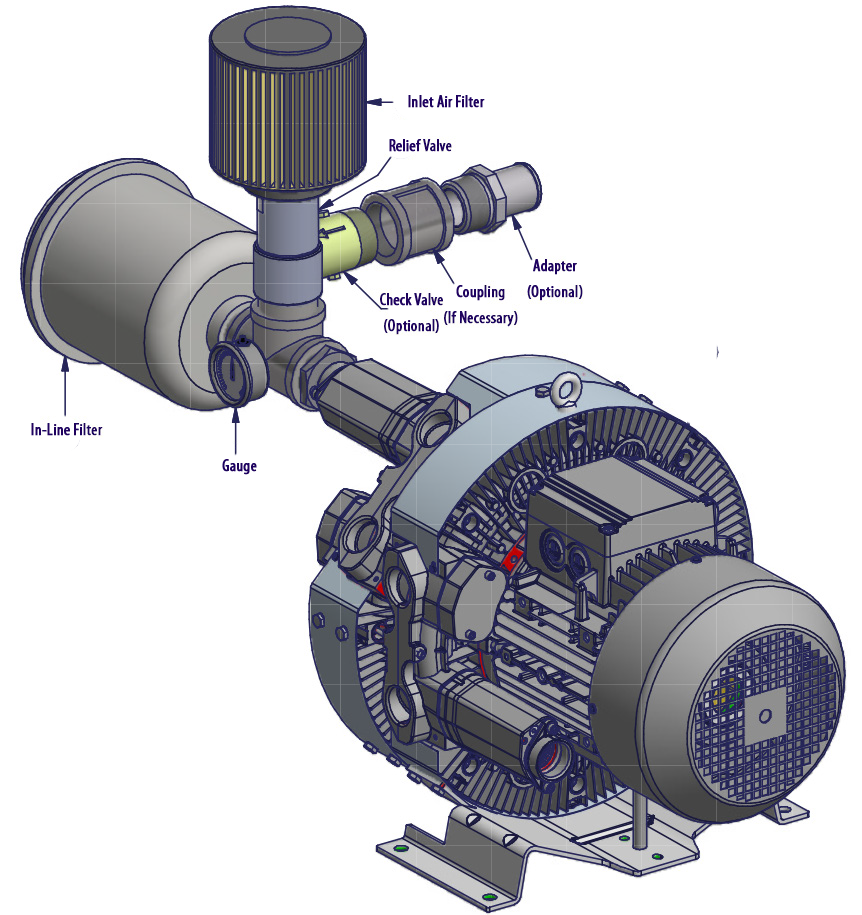N/A All Republic Regenerative Blowers are available in pre-assembled kits for either pressure or vacuum applications. These kits include an inlet filter, gauge and relief valve, and are factory tested prior to shipment. Optional items for these kits include check valve, and tube adaptor; washdown motors, explosion proof motors, or other specialty motors; noise enclosures; and control panels such as VFD's, PLC's, or starter panels. |
