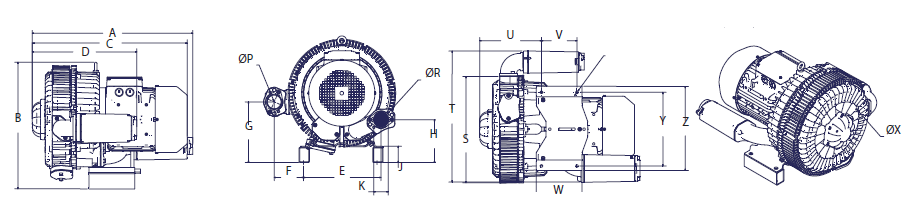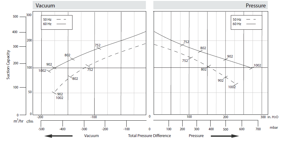 N/A The performance curves are based on air at a temperature of 59 ºF and an atmospheric pressure of 29.91 inch Hg with a tolerance of ±10%. The total pressure differences are valid for inlet and ambient temperatures up to 77 ºF. Suction capacity relates to inlet conditions. Pressure capacity relates to atmospheric conditions. For other conditions please contact Republic. Three phase motor tolerances are ±10% for fixed voltage motors and ±5% for voltage range motors. Single phase machines are designed with a ±5% tolerance. The frequency tolerance is ±2% maximum. |