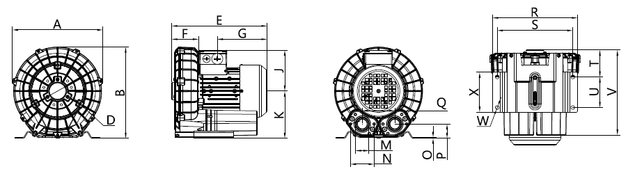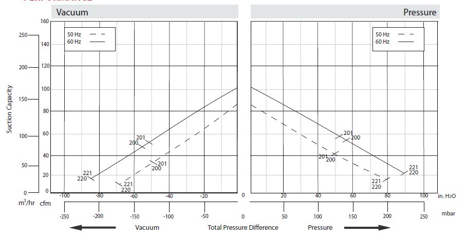N/A The performance curves are based on air at a temperature of 59 ºF and an atmospheric pressure of 29.91 inch Hg with a tolerance of ±10%. The total pressure differences are valid for inlet and ambient temperatures up to 77 ºF. Suction capacity relates to inlet conditions. Pressure capacity relates to atmospheric conditions. For other conditions please contact Republic. Three phase motor tolerances are ±10% for fixed voltage motors and ±5% for voltage range motors. Single phase machines are designed with a ±5% tolerance. The frequency tolerance is ±2% maximum. |