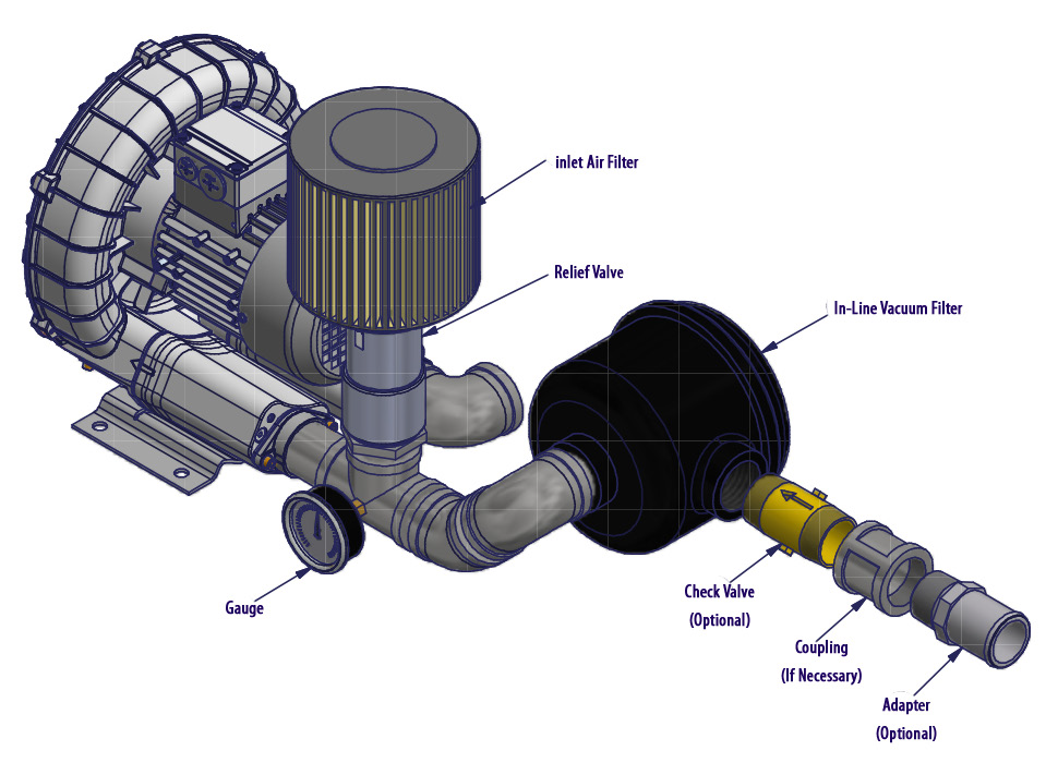 N/A All Republic Regenerative Blowers are available in pre-assembled kits for either pressure or vacuum applications. These kits include an inlet filter, gauge and relief valve, and are factory tested prior to shipment. Optional items for these kits include check valve, and tube adaptor; washdown motors, explosion proof motors, or other specialty motors; noise enclosures; and control panels such as VFD's, PLC's, or starter panels. |