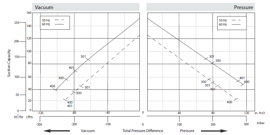 N/A The performance curves are based on air at a temperature of 59 ºF and an atmospheric pressure of 29.91 inch Hg with a tolerance of ±10%. The total pressure differences are valid for inlet and ambient temperatures up to 77 ºF. Suction capacity relates to inlet conditions. Pressure capacity relates to atmospheric conditions. For other conditions please contact Republic. Three phase motor tolerances are ±10% for fixed voltage motors and ±5% for voltage range motors. Single phase machines are designed with a ±5% tolerance. The frequency tolerance is ±2% maximum. |