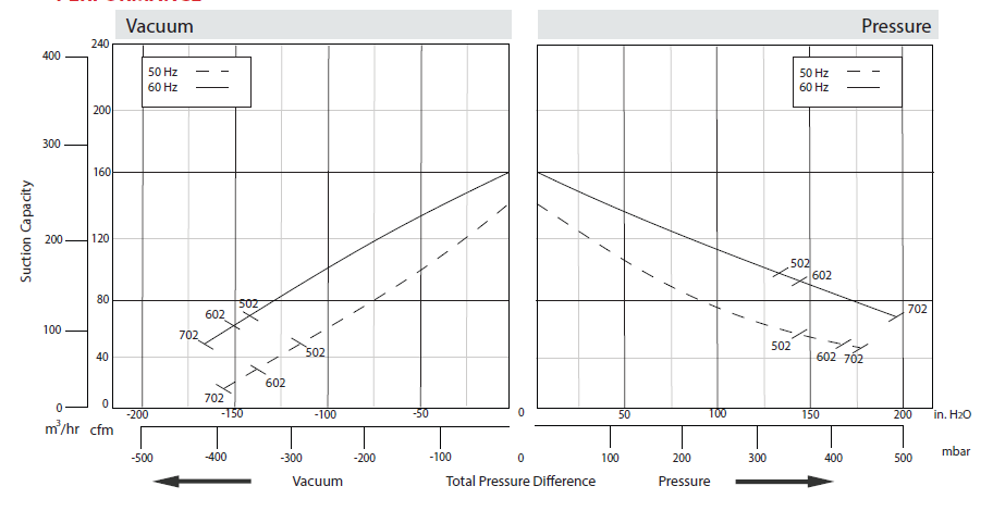N/A The performance curves are based on air at a temperature of 59 ºF and an atmospheric pressure of 29.91 inch Hg with a tolerance of ±10%. The total pressure differences are valid for inlet and ambient temperatures up to 77 ºF. Suction capacity relates to inlet conditions. Pressure capacity relates to atmospheric conditions. For other conditions please contact Republic. Three phase motor tolerances are ±10% for fixed voltage motors and ±5% for voltage range motors. Single phase machines are designed with a ±5% tolerance. The frequency tolerance is ±2% maximum. |