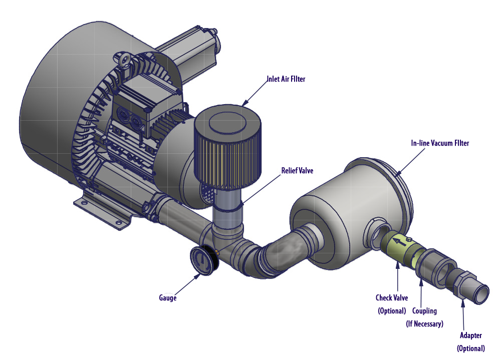 N/A All Republic Regenerative Blowers are available in pre-assembled kits for either pressure or vacuum applications. These kits include an inlet filter, gauge and relief valve, and are factory tested prior to shipment. Optional items for these kits include check valve, and tube adaptor; washdown motors, explosion proof motors, or other specialty motors; noise enclosures; and control panels such as VFD's, PLC's, or starter panels. |
