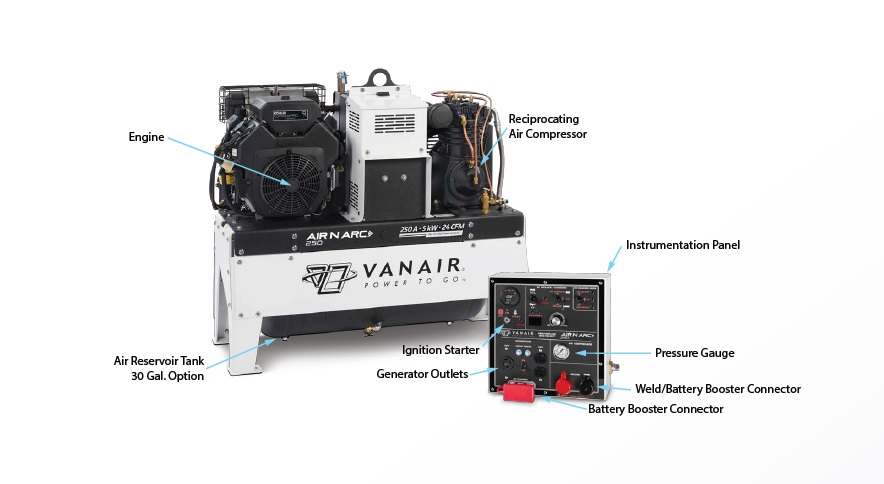 The Air N Arc® 250 provides you with five forms of power in one machine. Offering 250 amps of welding capabilities and a 2-stage reciprocating air compressor for the pressure you need to get the job done, the Air N Arc® 250 performance can't be beat. It also features a EFI engine to save on fuel and to provide the horsepower you need for effective multi-functioning of tools.