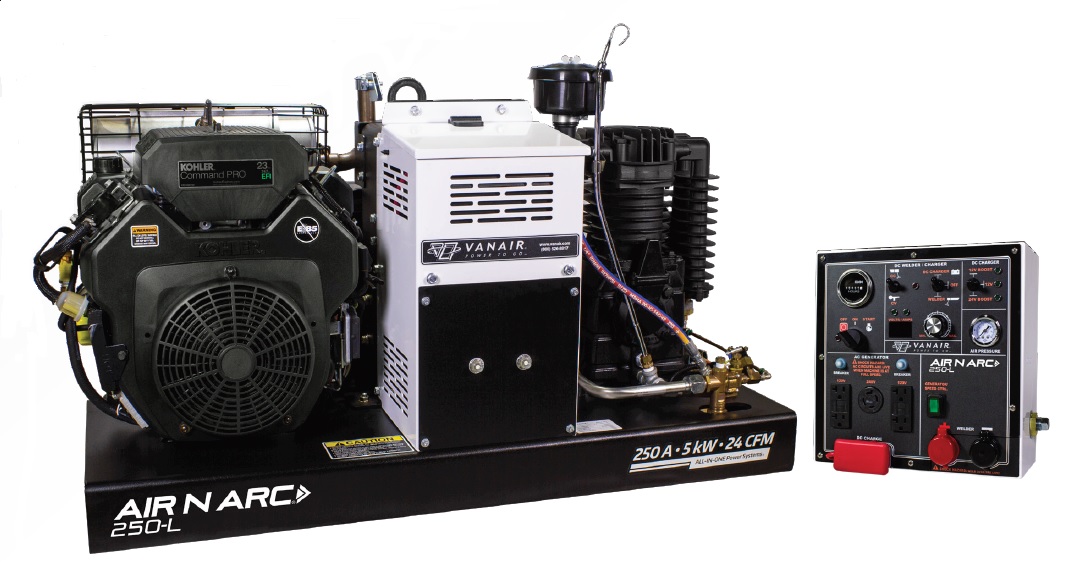 The Air N Arc® 250-L features an aluminum reciprocating air end, base, and sheet metal to reduce the weight of a standard steel skid mount system by 30%. The Air N Arc® 250-L still offers all the advantages you expect from an All-In-One Power System® including five forms of power in a single machine, increased availability of valuable bed space, reduced spending costs on purchasing multiple machines, and reduced truck idle time by turning off the truck. Be ready any time, by having all your necessary power sources on board, all of the time!