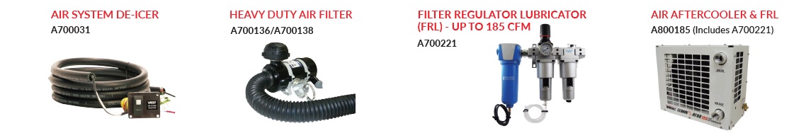 Item# - A700031 Item Name - Air System De-Icer Item# - A700136 Item Name - Heavy-Duty Air Filter Item# - A700138 Item Name - Heavy-Duty Air Filter Item# - A700221 Item Name - Filter Regulator Lubricator (FRL) - Up to 185 CFM Item# - A800185 Item Name - Air Aftercooler & Filter Regulator Lubricator (FRL) Item# - A700221 Item Name - Air Aftercooler & Filter Regulator Lubricator (FRL) |