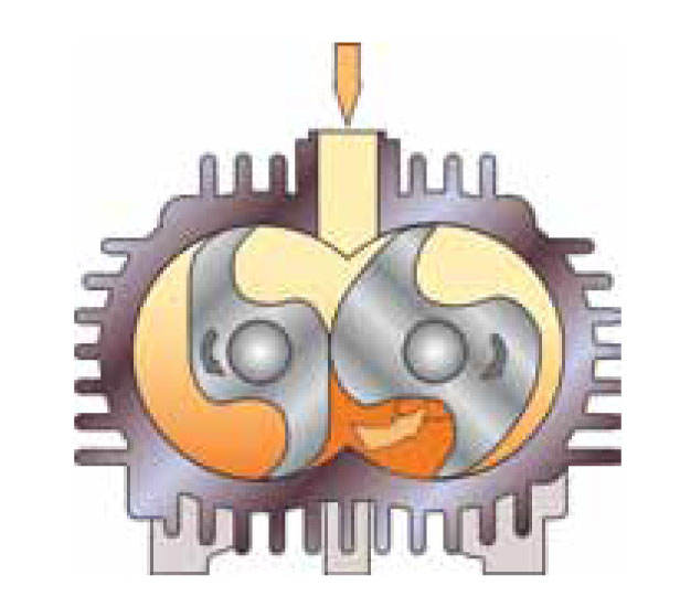 N/A Inside the pump housing, two claw shaped rotors take in air as they rotate in opposite directions. The air is compressed by the rotors, then discharged through a silencer to atmosphere. The pumping chamber is dry. There is no contact between the rotors or the cylinder wall eliminating internal wear and parts to replace. The rotors are synchronized by gears requiring a small amount of oil in the gear housing. Gear oil change requirements are minimal at approximately 20,000 hours. |