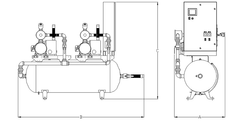 N/A The system shall include an ASME rated air receiver. The tank shall be internally lined and come with a manual drain and sight gauge. Systems with Basic Controls are also equipped with a vacuum gauge. Receiver is plumbed so that system vacuum must pass through the air receiver prior to the pumps to provide additional protection for the pumps. |