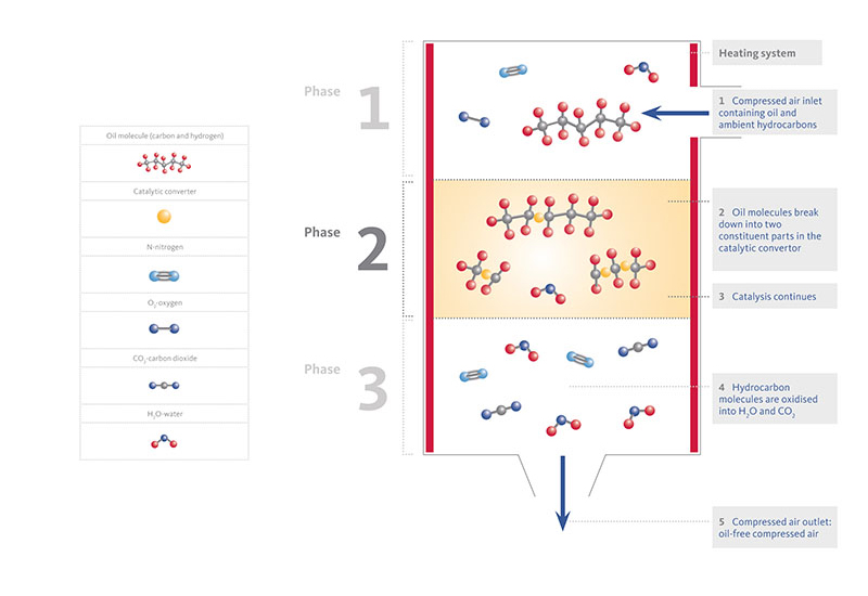 The BEKOKAT® operates with a catalytic system (catalyst) which has been developed and optimized in particular for the total oxidation of hydrocarbons (lubricants, oil, anthropogenic air components, i.a. sulphur dioxide, carbon monoxide, nitrogenous gases) in compressed air.