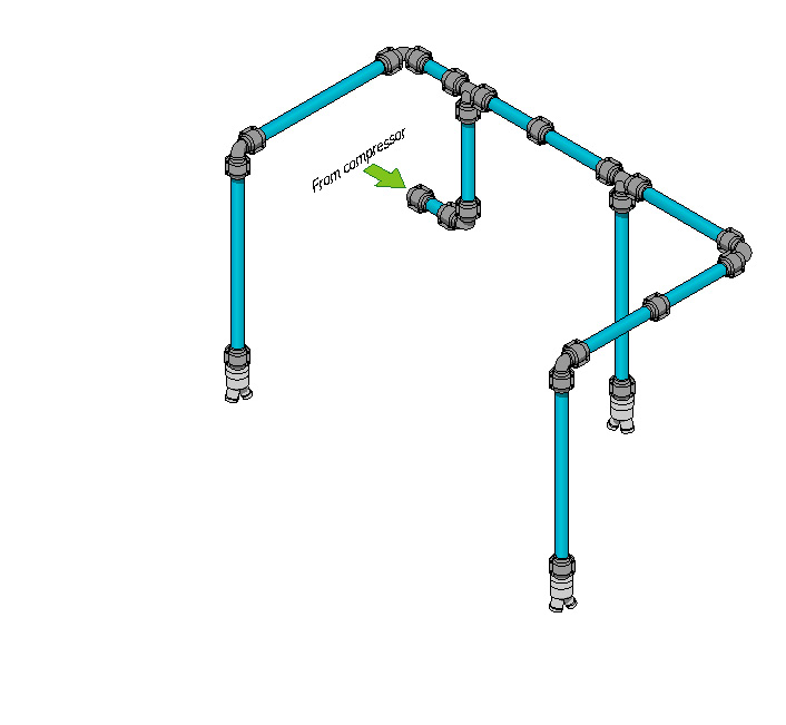 2000 - 1 in. Blue Aluminum Pipe - Quantity 5 2002 - 1 in. Union - Quantity 6 2003 - 1 in. Elbow - Quantity 5 2005 - 1 in. Tee - Quantity 2 2117 - 1 in. Pipe to 3/4 in. Male NPT Adapter - Quantity 1 2023 - Wall Outlet Station with two 1/2 in. Female NPT Ports - Quantity 3 2022 - 1 in. Pipe Mounting Clips - Quantity 20 |