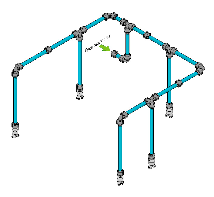 2000 - 1 in. Blue Aluminum Pipe - Quantity 12 2002 - 1 in. Union - Quantity 23 2003 - 1 in. Elbow - Quantity 5 2005 - 1 in. Tee - Quantity 4 2117 - 1 in. Pipe to 3/4 in. Male NPT Adapter - Quantity 1 2023 - Wall Outlet Station with two 1/2 in. Female NPT Ports - Quantity 5 2022 - 1 in. Pipe Mounting Clips - Quantity 30 |