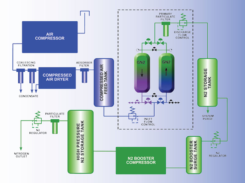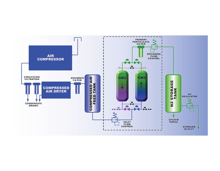 The earth’s atmosphere is comprised of approximately 78% nitrogen and 21% oxygen. Once atmospheric air is compressed, its pressure is increased while proportions of nitrogen and oxygen remain unchanged. Once the air is compressed it must be filtered and dried prior to its introduction to the GN2 system. |