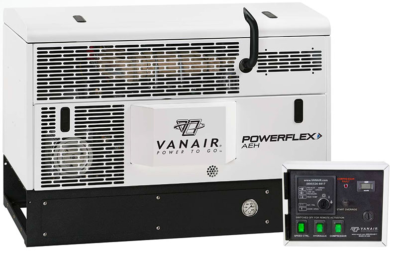 The PowerFlex™ AEH is equipped with a 40 CFM at 150 PSI rotary screw air compressor, a 6,800 watt AC generator, and powerful hydraulic pump, providing 13 GPM and up to 3000 PSI. Save fuel costs, increase your productivity and meet EPA challenges with the PowerFlex&trade™ AEH.