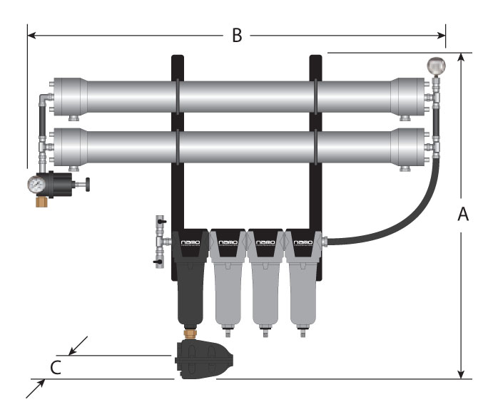 N/A Air from your plant compressed air system enters the system through the inlet ports (A). It then passes through a nano NWS centrifugal water separator to remove any bulk condensate (B). Collected condensate is expelled from the system using a nano NMD magnetic zero air loss drain (C). The air then passes through three nano NF filters in series: an M1 1.0 micron coalescing filter (D), an M01 0.01 micron coalescing filter (E), and an AC activated carbon filter (F). This removes remaining liquid aerosols, solid particulate and oil vapor. The air then passes through one or more membrane Nitrogen generators (G). The generator contains hundreds of thousands of hollow fibers which separate the Nitrogen from the air through a process known as selective permeation. The walls of these fibers allow Oxygen and water vapor molecules to pass through but not Nitrogen. A simple manual valve (H) controls the flow and thereby the purity of the Nitrogen. Clean, pure, dry Nitrogen then flows out of the outlet port to your downstream process. |