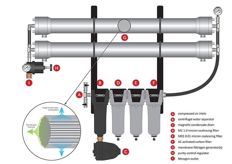 N/A Air is 78% Nitrogen. The nano NMG Nitrogen generators use a simple and proven membrane technology to separate this Nitrogen from the air simply and cost effectively with no moving parts or electricity. Why pay a gas company to deliver Nitrogen cylinders or dewars to your facility when you can generate your own clean, endless supply of high purity Nitrogen using the compressed air you already have on site? It's a more reliable, more cost effective, safer way to get the Nitrogen you need, right where you need it. |