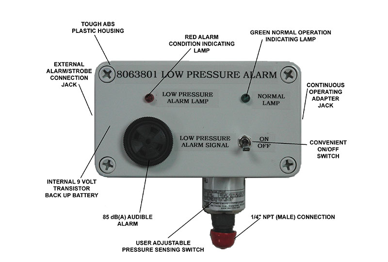 Model 8063801 is designed to allow the user to pre-select a low pressure alarm setting between 30 and 300 psi with a 1% repeatability accuracy. The Factory preset alarm setting is 100 psi, which can be changed by the user if desired.