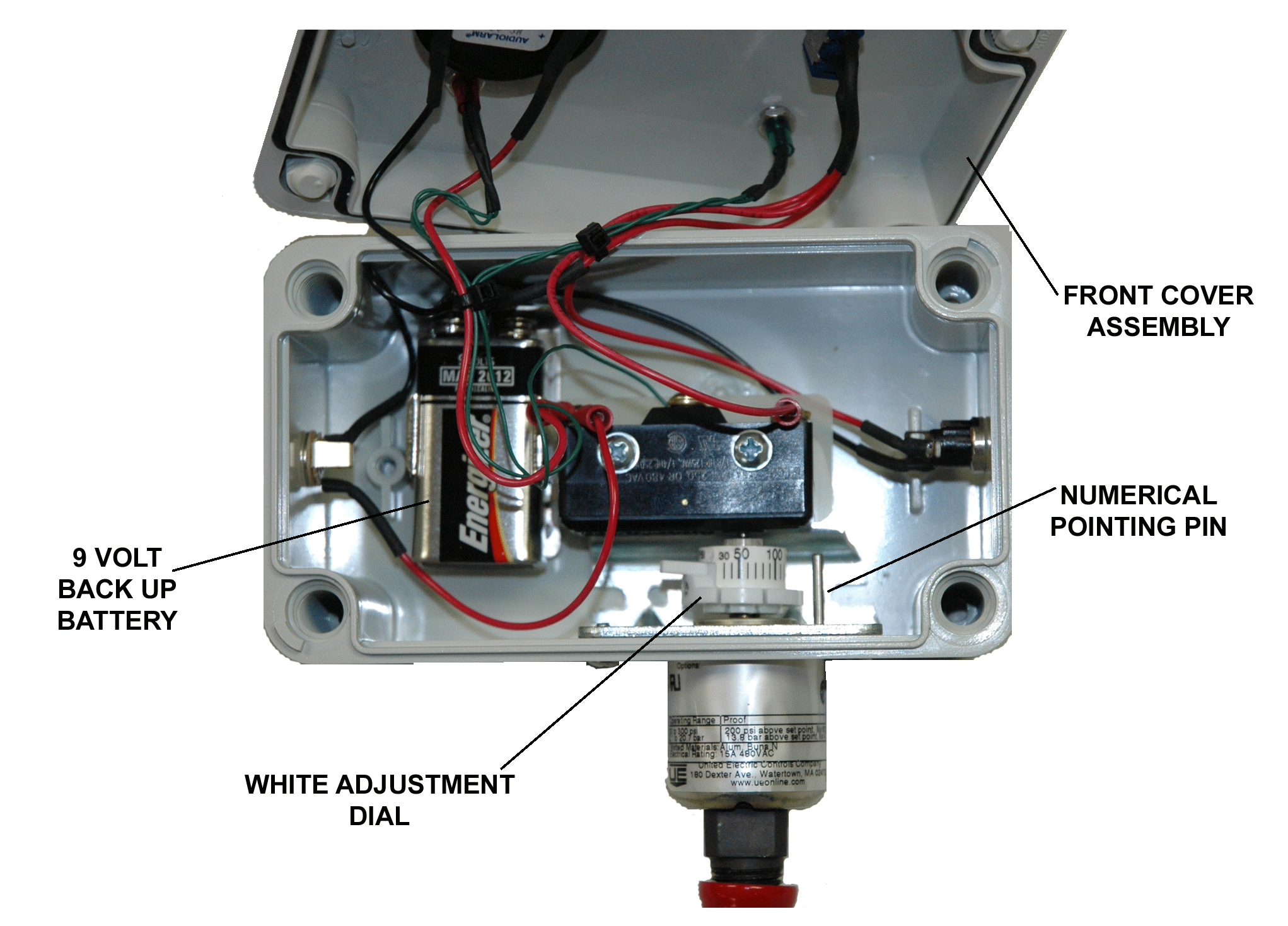 Locate a suitable place to mount or install the Model 8063801 unit and secure by threading the 1/4" NPT connection to the proper mating pipe size. Use ONLY THE FLAT AREA ON THE PRESSURE SWITCH to secure and tighten the unit. DO NOT OVER TIGHTEN - USE THREAD TAPE. Should the factory pre-set level be satisfactory, the unit is ready to operate by pressurizing the system and turning the "ON-OFF" Switch to the "ON" position. If pressure is above preset alarm level setting, the green LED should illuminate. Should you need to adjust the switch to some other setting, carefully loosen the four (4) screws located at the four corners of the housing and carefully lift off front cover to expose the pressure switch and internal wiring/battery. Locate the white adjustment dial located at the base of the pressure switch. Note: The numbers located on the adjustment dial are for approximation only - DO NOT assume the setting noted on the dial is the alarm set pressure. Adjust system pressure to alarm set point level desired and turn adjustment dial until the unit just activates the alarm. Slowly increase the system pressure above this setting until alarm stops. Slowly lower system pressure until alarm activates. Note system pressure, and if this is the desired alarm set point, the unit is ready for operation. Readjust if necessary and replace front cover taking care not to pinch any wiring between housing and cover. |