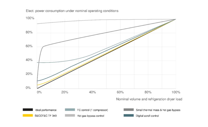 The load on a refrigerated dryer doesn't just depend on the volume of compressed air to be dried (grey area), but more importantly depends on how much water the incoming compressed air contains. The volume of water (moisture) increases as the temperature rises, so the load on refrigerated dryers increases dramatically when ambient temperatures are high, such as during summer (yellow curve). Conversely, when the temperature drops during the winter (turquoise curve), there is less load on refrigerated dryers. To maintain a stable pressure dew point throughout these fluctuations, refrigerated dryers should be designed to provide sufficient performance during peak load times, and have additional reserve capacity. Like the flow rate and temperature range, refrigerated dryers are always operating within the load range of 0 to 100 %. Because SECOTEC storage control ensures energy is only used as needed across this entire load range, users benefit from exceptional savings. |