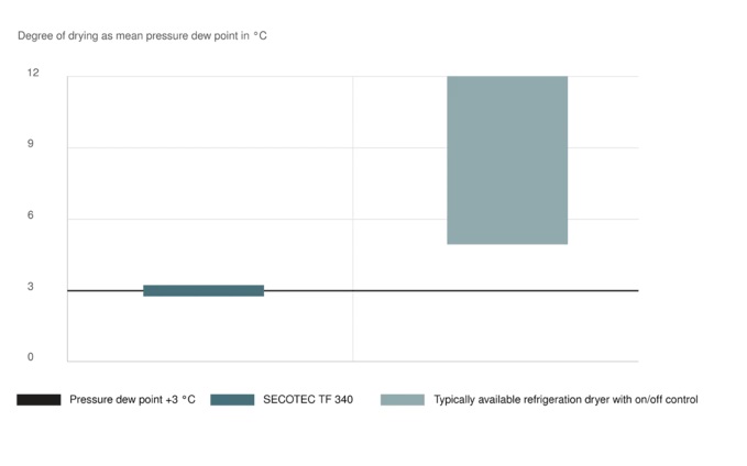 SECOTEC refrigerated dryers ensure stable pressure dew points in all load phases. Dried compressed air can cool to a temperature of + 38ºF (= achievable pressure dew point) without the moisture in the air condensing. Even at higher ambient temperatures, this ensures optimal protection for downstream compressed air systems and points-of-use. Conventional refrigerated dryers with switching operating modes, but without an additional thermal mass, use the heat exchanger material itself as a thermal mass. In these dryers, it is therefore necessary to switch the refrigerant compressors and fan motors on and off much more frequently in order to maintain the required cooling performance. To reduce switching frequency and wear, the refrigerant circuit therefore only switches on at much higher pressure dew points. The resulting fluctuations in the pressure dew point negatively affect drying performance. This can be risky, since corrosion can occur even with relative compressed air humidity of 40 % - corrosion can therefore occur even without condensate forming. SECOTEC refrigerated dryers, on the other hand, ensure material-friendly operation thanks to their high thermal storage capacity. Once the thermal mass has been charged, the refrigerant compressor and fan motor can remain switched off for much longer periods of time without impacting pressure dew point stability. |