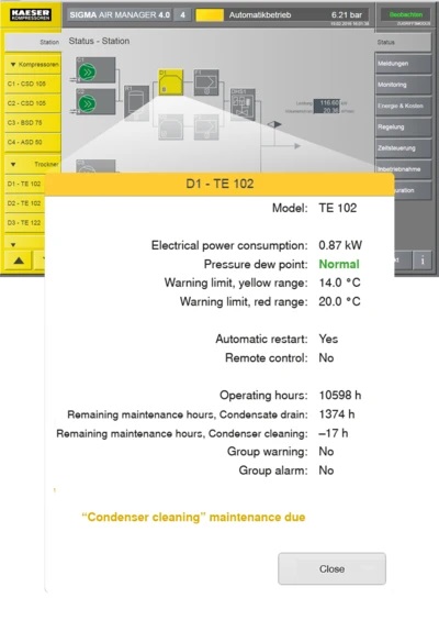 With the Modbus TCP module, SECOTEC refrigerated dryers can be easily integrated into the SIGMA NETWORK. All essential operational parameters and messages are available in real-time. This enables comprehensive system monitoring of the entire compressed air station and creates the basis for needs-based preventive maintenance. The result: Maximum availability with minimal costs. In addition, SIGMA AIR MANAGER 4.0 provides a complete overview of all essential operating parameters of the refrigeration dryers. Color-coded warnings and alarms are displayed in the compressed air station's P&I diagram. By clicking the dryer icon, all key operational parameters and message texts are displayed in plain text. |