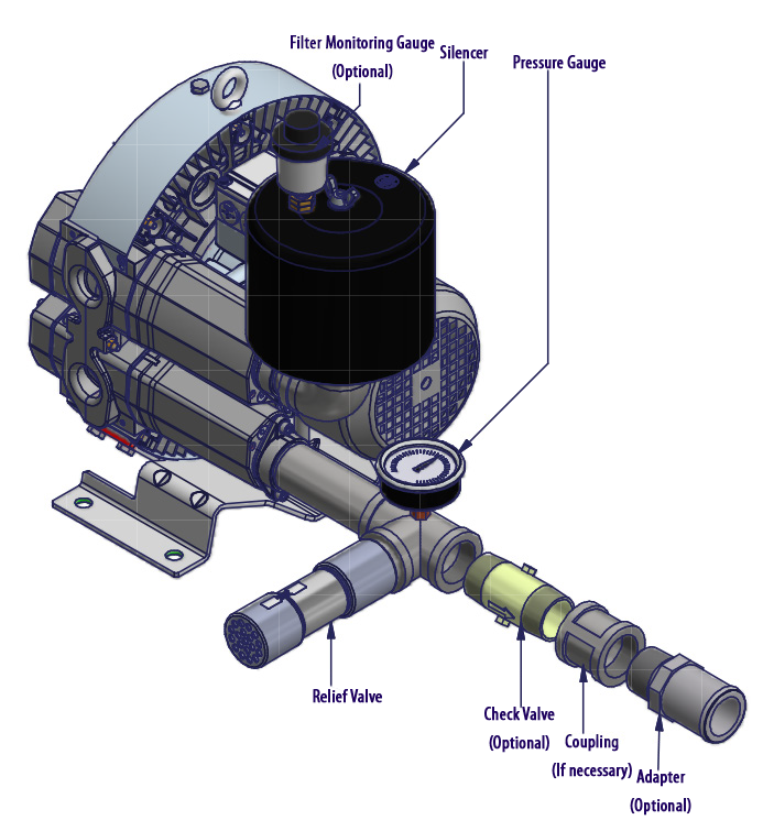 N/A All Republic Regenerative Blowers are available in pre-assembled kits for either pressure or vacuum applications. These kits include an inlet filter, gauge and relief valve, and are factory tested prior to shipment. Optional items for these kits include check valve, and tube adaptor; washdown motors, explosion proof motors, or other specialty motors; noise enclosures; and control panels such as VFD's, PLC's, or starter panels. |