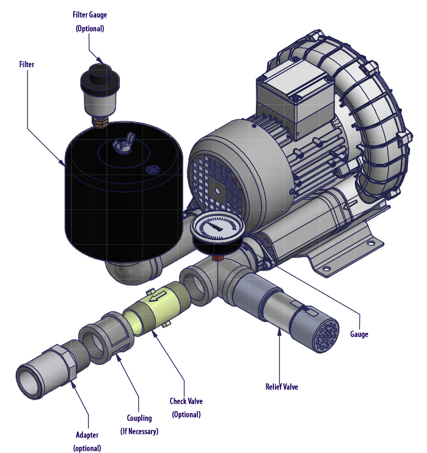 N/A All Republic Regenerative Blowers are available in pre-assembled kits for either pressure or vacuum applications. These kits include an inlet filter, gauge and relief valve, and are factory tested prior to shipment. Optional items for these kits include check valve, and tube adaptor; washdown motors, explosion proof motors, or other specialty motors; noise enclosures; and control panels such as VFD's, PLC's, or starter panels. |
