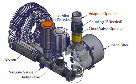 N/A All Republic Regenerative Blowers are available in pre-assembled kits for either pressure or vacuum applications. These kits include an inlet filter, gauge and relief valve, and are factory tested prior to shipment. Optional items for these kits include check valve, and tube adaptor; washdown motors, explosion proof motors, or other specialty motors; noise enclosures; and control panels such as VFD's, PLC's, or starter panels. |
