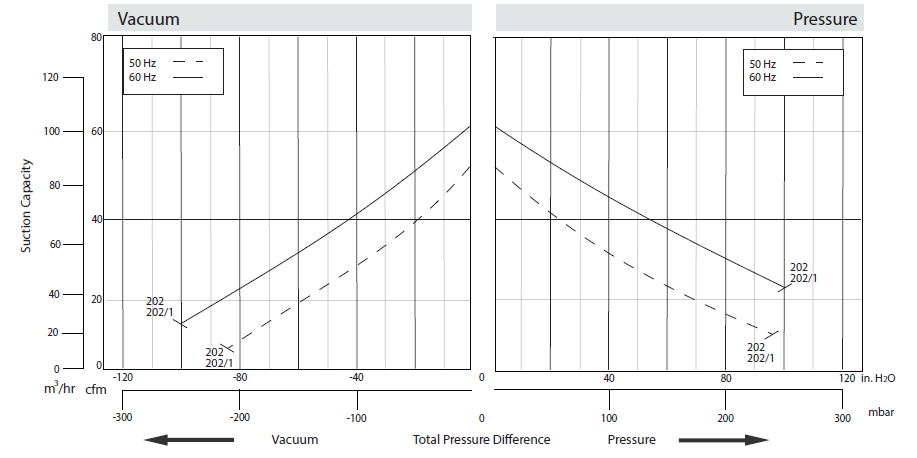 N/A The performance curves are based on air at a temperature of 59 ºF and an atmospheric pressure of 29.91 inch Hg with a tolerance of ±10%. The total pressure differences are valid for inlet and ambient temperatures up to 77 ºF. Suction capacity relates to inlet conditions. Pressure capacity relates to atmospheric conditions. For other conditions please contact Republic. Three phase motor tolerances are ±10% for fixed voltage motors and ±5% for voltage range motors. Single phase machines are designed with a ±5% tolerance. The frequency tolerance is ±2% maximum. |