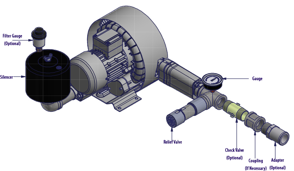 N/A All Republic Regenerative Blowers are available in pre-assembled kits for either pressure or vacuum applications. These kits include an inlet filter, gauge and relief valve, and are factory tested prior to shipment. Optional items for these kits include check valve, and tube adaptor; washdown motors, explosion proof motors, or other specialty motors; noise enclosures; and control panels such as VFD's, PLC's, or starter panels. |