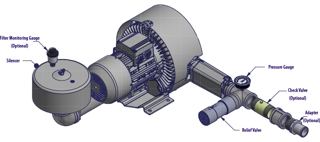 N/A All Republic Regenerative Blowers are available in pre-assembled kits for either pressure or vacuum applications. These kits include an inlet filter, gauge and relief valve, and are factory tested prior to shipment. Optional items for these kits include check valve, and tube adaptor; washdown motors, explosion proof motors, or other specialty motors; noise enclosures; and control panels such as VFD's, PLC's, or starter panels. |