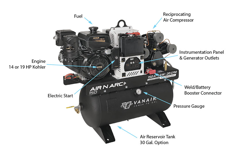 The Air N ARC 150 provides you with four forms of power in one compact and economic unit, allowing you to save space and weight on your vehicle. Providing up to 190 AMPs of welding power, the Air N Arc® 150 is available in three configurations to meet your mounting needs.