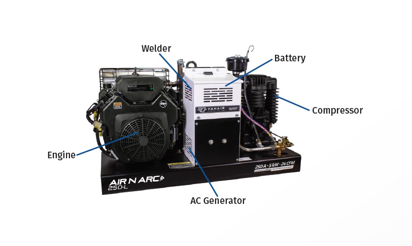 The Air N Arc® 250-L features an aluminum reciprocating air end, base, and sheet metal to reduce the weight of a standard steel skid mount system by 30%. The Air N Arc® 250-L still offers all the advantages you expect from an All-In-One Power System® including five forms of power in a single machine, increased availability of valuable bed space, reduced spending costs on purchasing multiple machines, and reduced truck idle time by turning off the truck. Be ready any time, by having all your necessary power sources on board, all of the time!