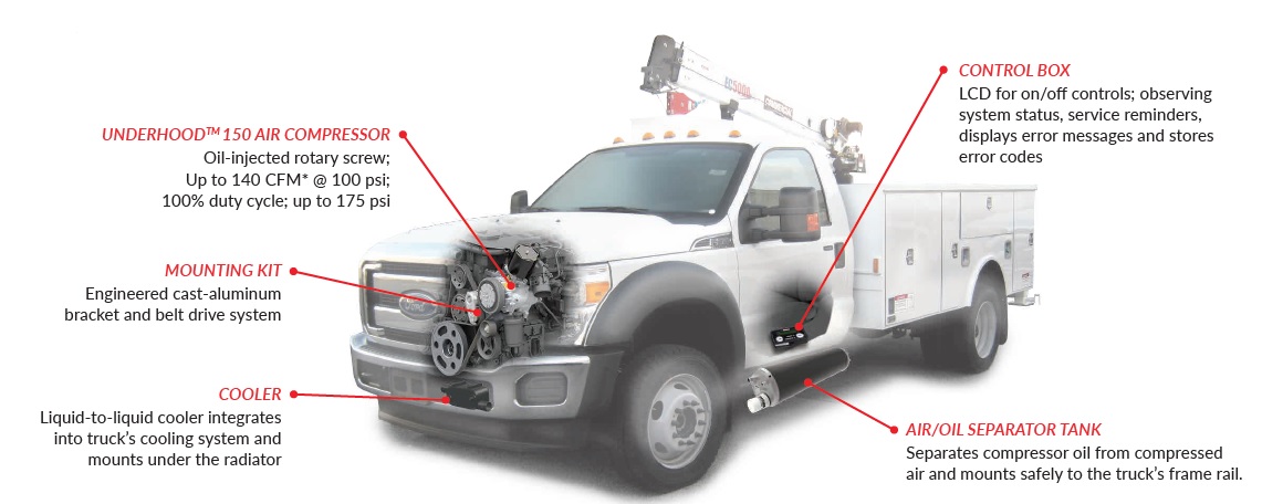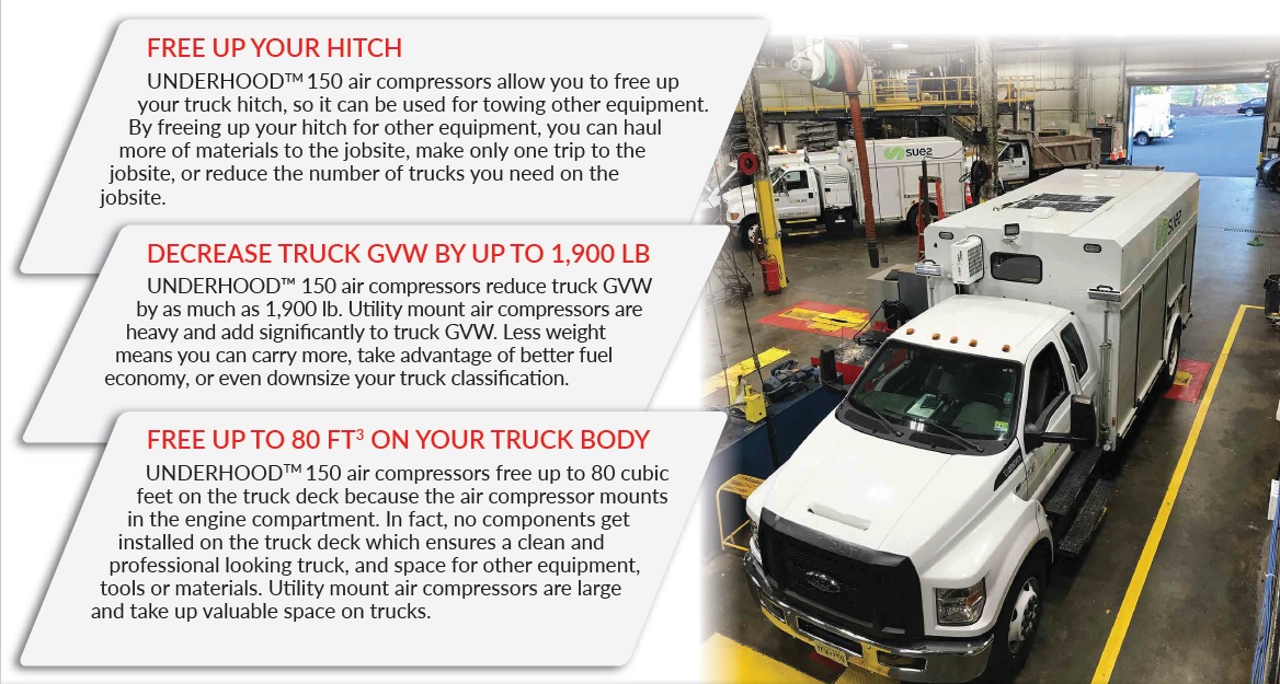 UNDERHOOD™ 150 air compressors allow you to free up your truck hitch, so it can be used for towing other equipment. By freeing up your hitch for other equipment, you can haul more of materials to the jobsite, make only one trip to the jobsite, or reduce the number of trucks you need on the jobsite.