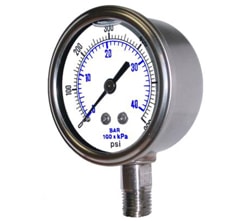 At Compressed Air Systems, we offer several types of pressure gauges that are housed in strong stainless steel, so you can choose the one that’s right for your needs. We have gauges that mount on the bottom and on the center back, as well as panel-mount and front-flanged options. The bottom-mounted gauges are available with dial sizes ranging from 1½ to 4 inches, while the other options have standard 2½-inch dials. All of these pressures gauges are available in several pressure ranges, with maximum pressures from 15 to 6,000psi.