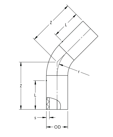 | 580801020 /Asset/a7552.jpg | N/A 2 Inch (in) Size 45 Degree Butt Sweep Elbow | Size N/A 2 in63 mm | Dimension s N/A 0.34 in | Dimension z N/A 6.69 in | Quote |