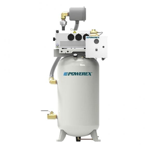 Powerex industrial vacuum tank mount systems feature a lubricated rotary vane pump, one of the simplest and most reliable pump types available. The use of oil in the pump produces higher efficiencies, lower operating temperatures, and lower sound levels. These pumps are also the most suitable to high ambient temperatures, which makes them ideal for manufacturing or process applications where environmental temperatures tend to be higher. These pumps also have the lowest initial cost and high ultimate vacuum levels (29.3 Hg in end vacuum). By tank mounting the pumps on an ASME air receiver and adding a UL listed NEMA 1 control panel, Powerex has designed systems that are perfect for manufacturing processes like material handling, packing, food processing, and printing.