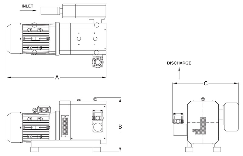 The claw shaped rotors inside the pump housing rotate in opposite directions, compressing the air and discharging through a silencer to the atmosphere. The two rotors are synchronized by gears that are oil lubricated to facilitate a long gear life.
